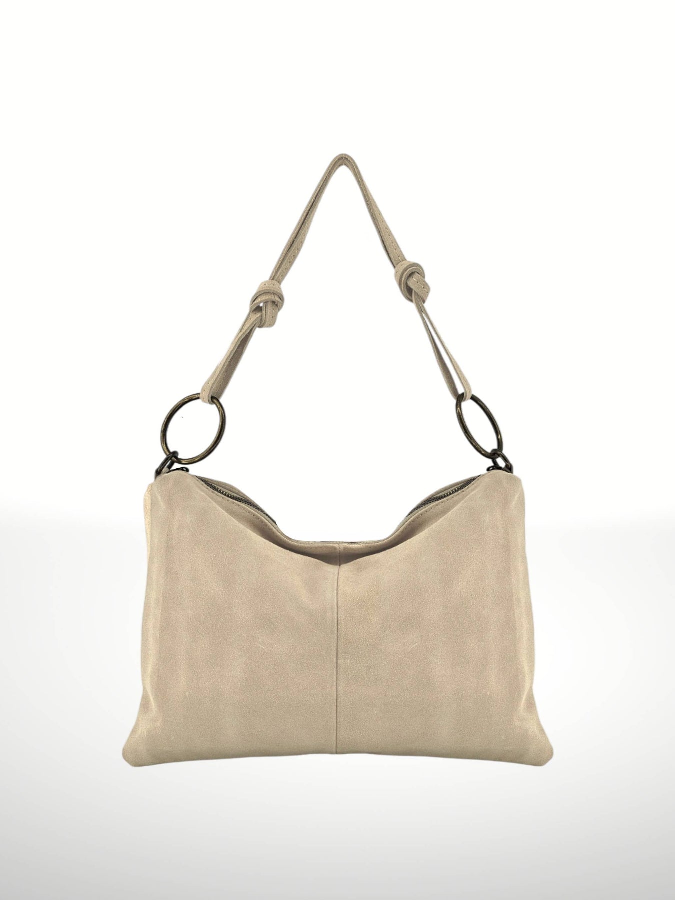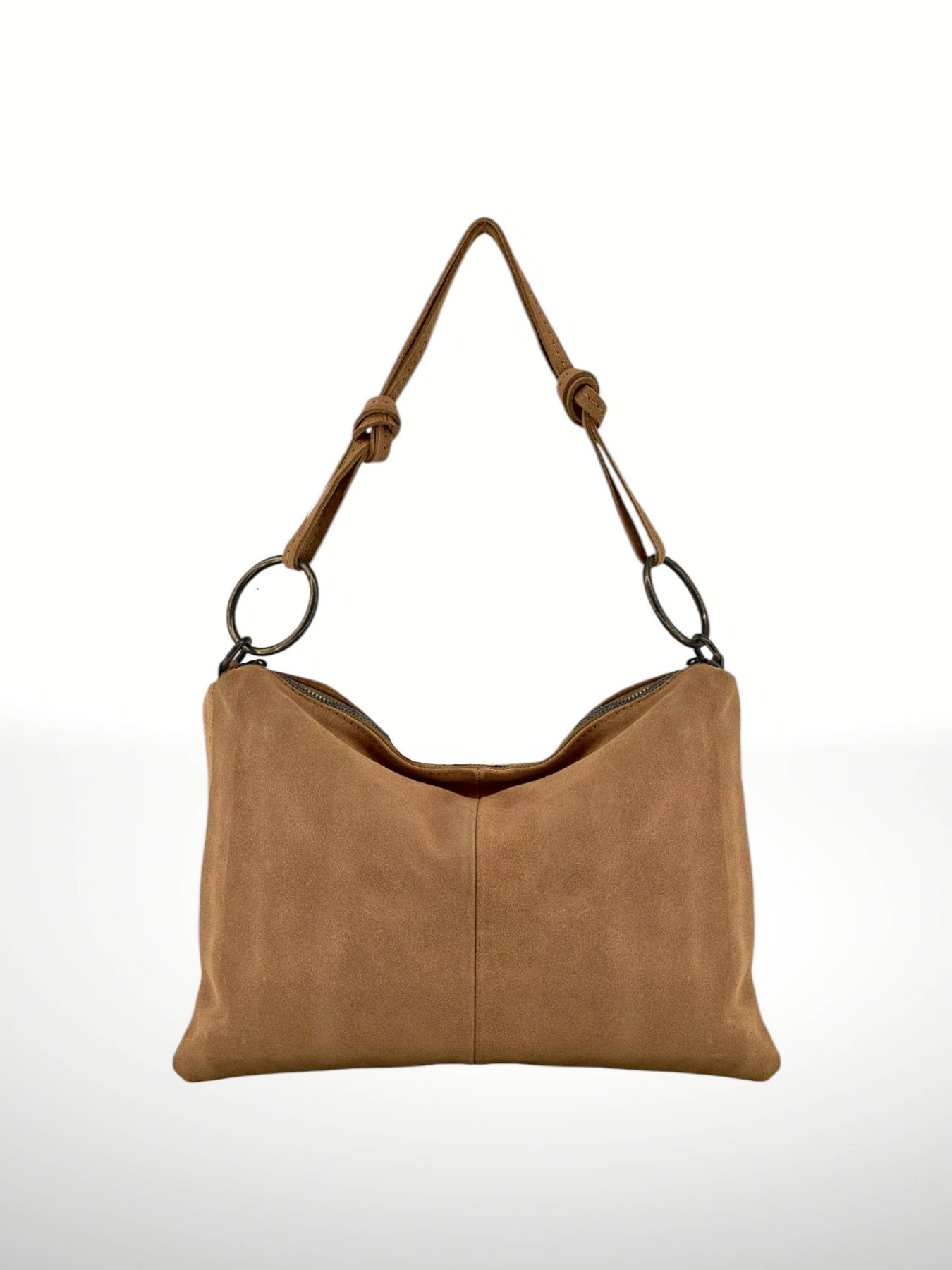 This bag combines elegance and versatility in a flexible and functional design. Made from genuine cowhide leather with a suede finish, its soft texture and exclusive details make it a sophisticated and practical piece. This bag features a zipper closure and an adjustable crossbody strap.