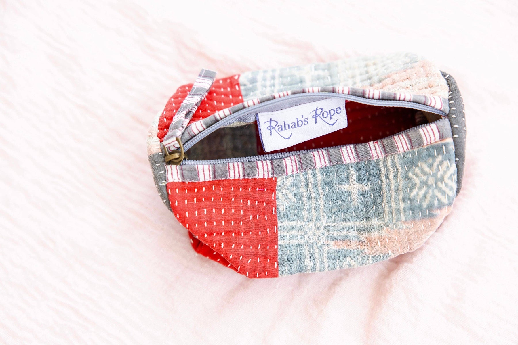 Handcrafted from upcycled vintage fabrics using traditional Kantha stitching, this unique pouch blends functionality with artistry.