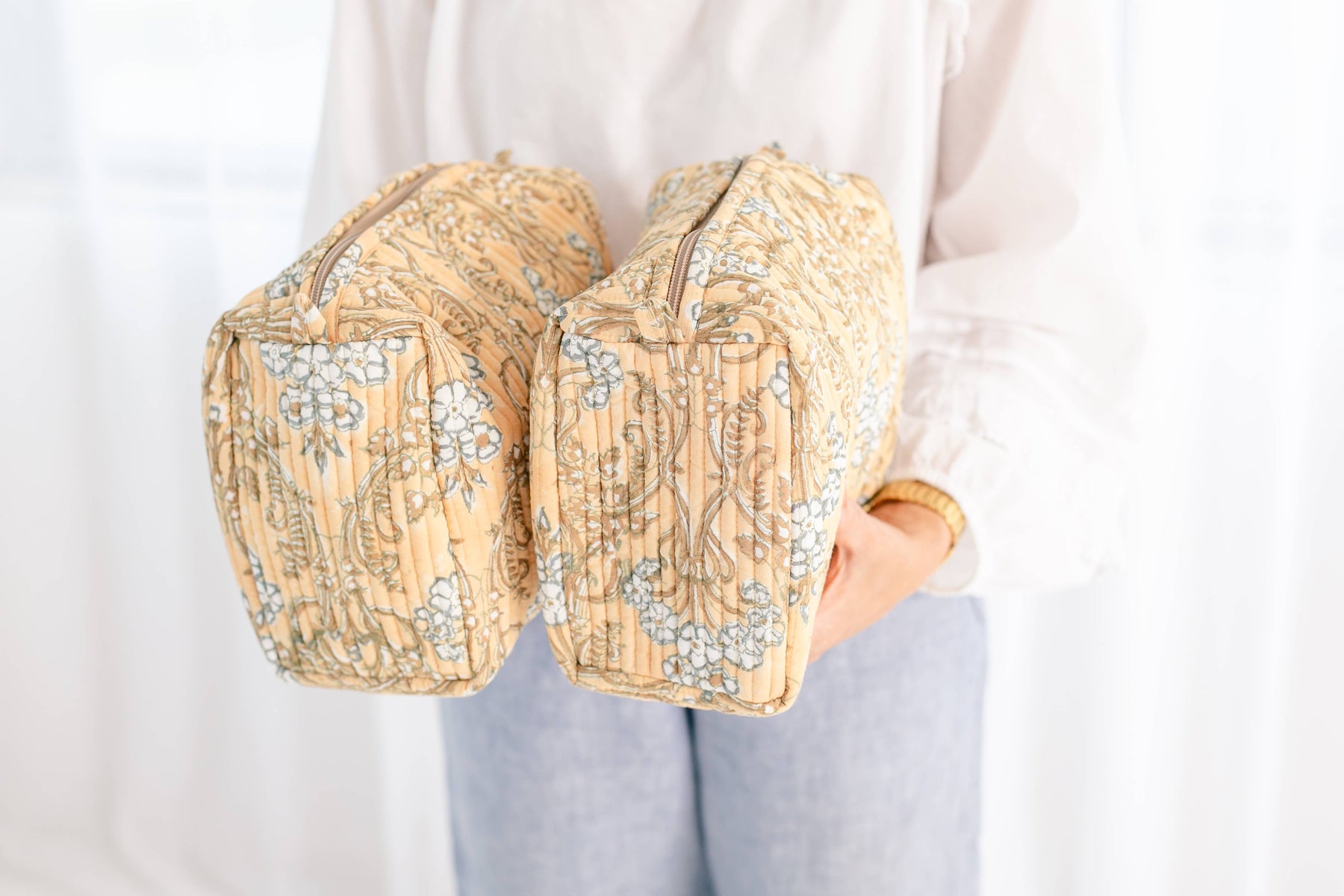 Add style and functionality to your travel, toiletries, or daily makeup routine with the Quilted Block Print Trellis Cosmetic Pouch.
