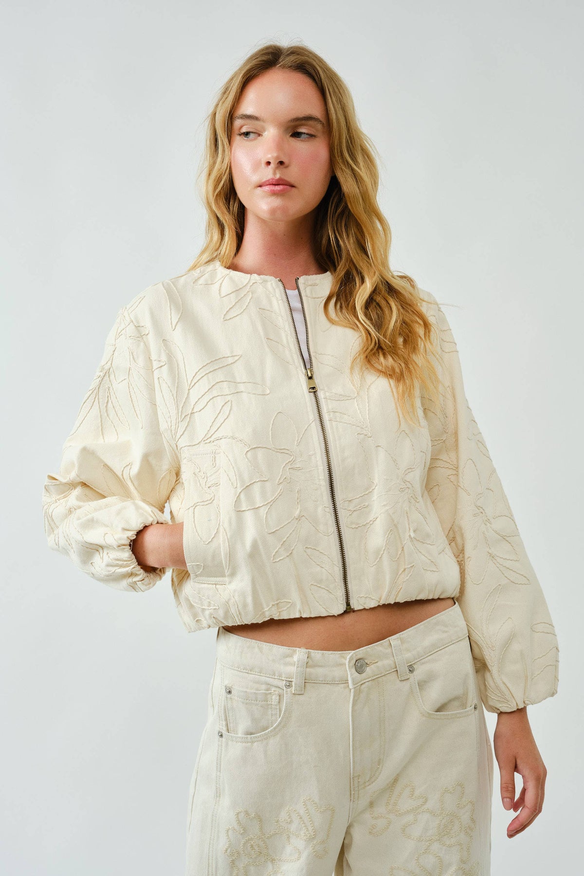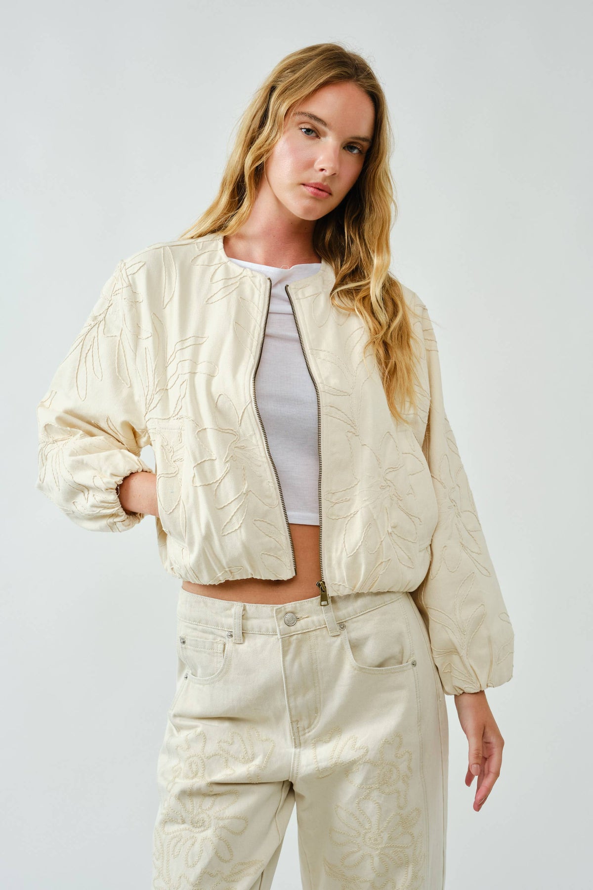 A soft neutral palette meets intricate floral embroidery in these bomber jacket. Designed with a relaxed fit and features elasticated hem at the waist and cuffs. The tonal stitching adds a subtle texture while keeping the look effortlessly wearable.