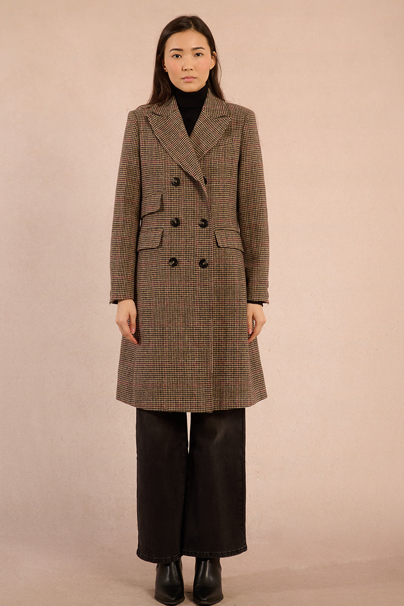 This short double-breasted jacket combines a vintage-inspired check with a soft, brushed finish that feels as cozy as it looks. Its rich mix of chocolate brown and sky blue creates an unexpected yet balanced color story — timeless with a twist.