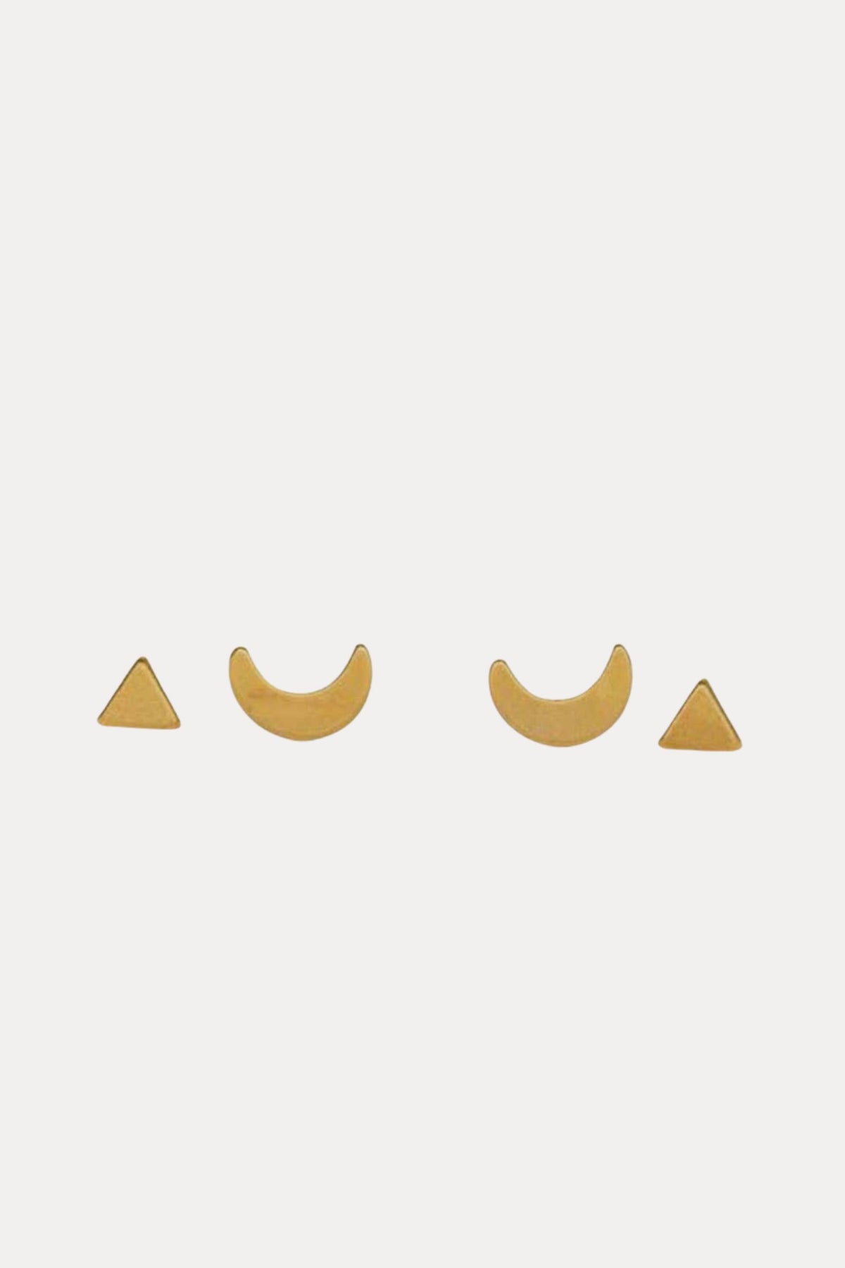Measuring 1/4" and made of 24k gold plated brass. Inspired by symbols of mysticism. The pyramid or triangle and the crescent moon both have long histories of symbolic significance in human culture.