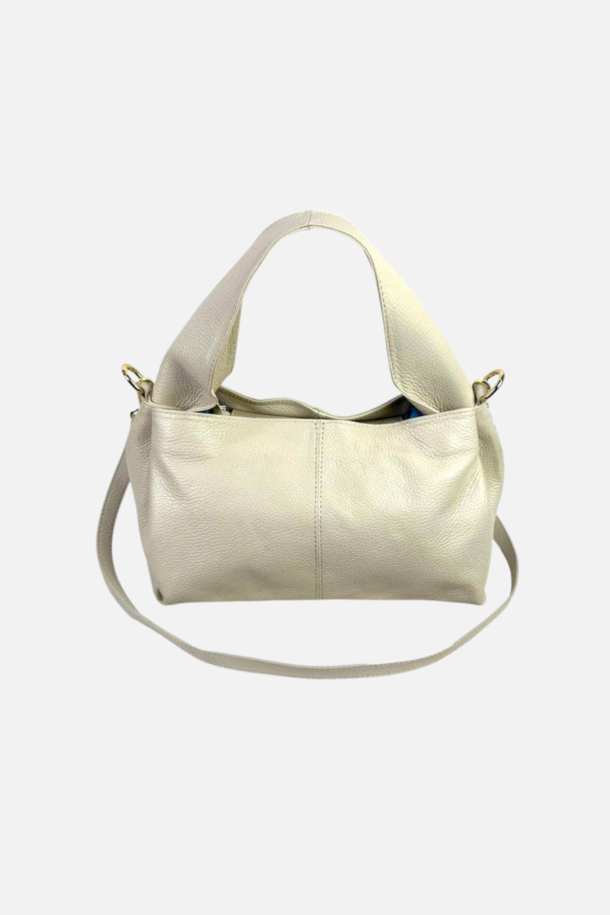 Italian Leather Handbag with thick short handles, adjustable & removable crossbody strap, zipper closure, and two internal pockets.