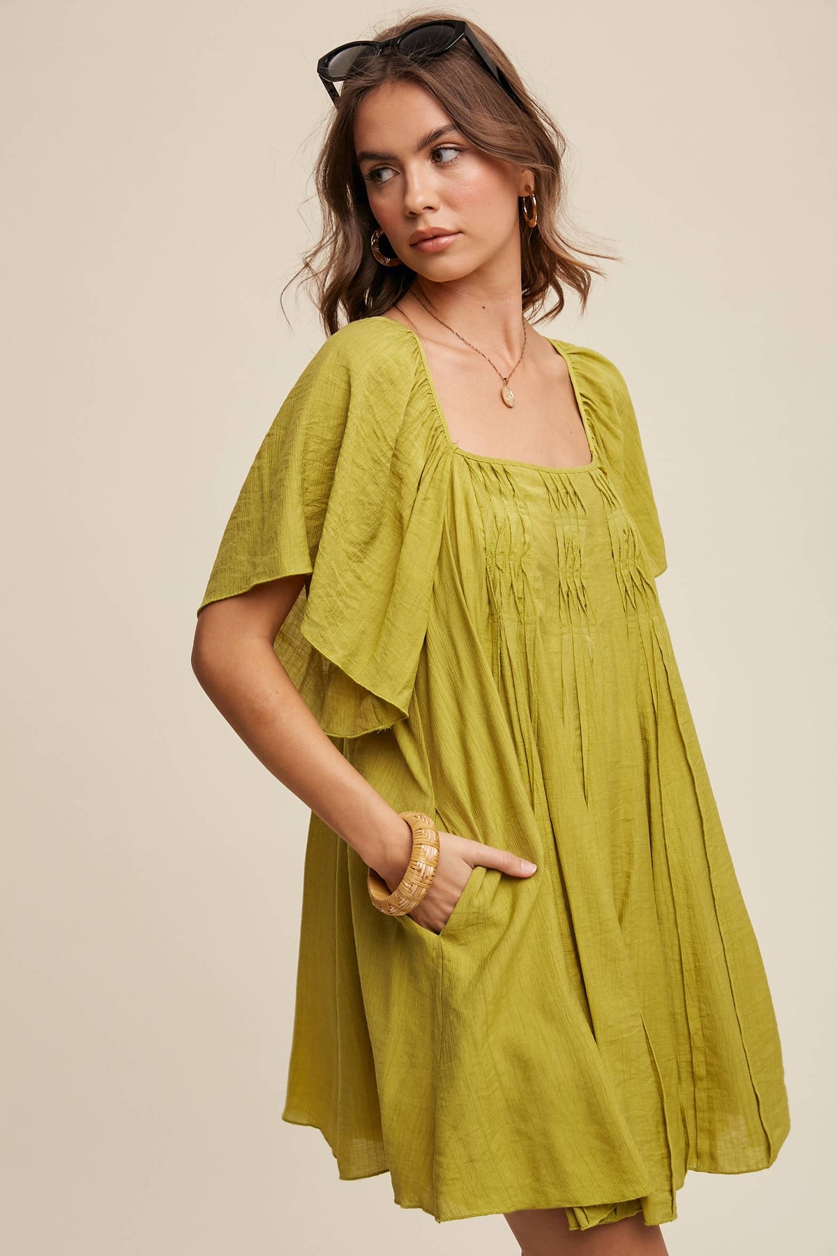 This flirty A-line mini dress features a comfy elastic square neckline that’s as chic as it is easy to wear. Made from lightweight textured fabric with full lining, it’s perfect for sunny days. Flutter sleeves bring a romantic breeze, while delicate pleats add just the right amount of flair. The open back with a sweet tie detail adds a playful twist, and handy side pockets keep things practical. Whether you’re brunching or dancing through summer evenings, this dress has you covered with effortless style and comfort.