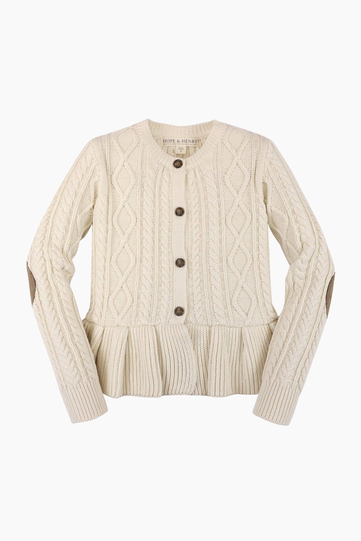 Sophistication and comfort, all in one gorgeous sweater! Our adorable peplum cardigan in soft organic cotton is adorned with a beautiful allover cable pattern that will keep your girl cozy and warm. Features faux suede elbow patches, faux horn buttons at the center front, and a ribbed peplum at the bottom for a feminine touch.