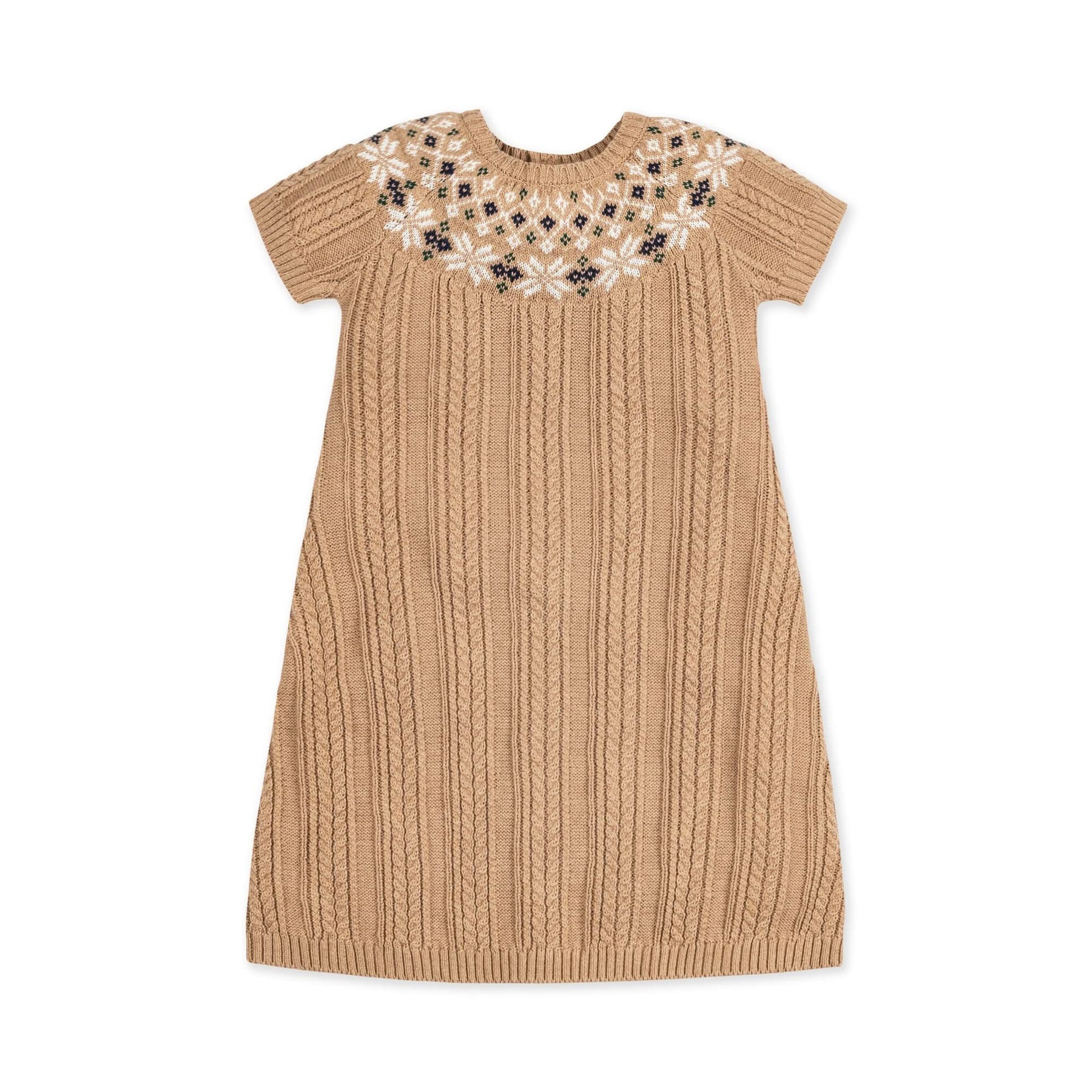 Dress your girl in style in our cable knit sweater dress in soft organic cotton. Features a beautiful cable knit throughout the bodice and sleeves, a beautiful fair isle intarsia design at the yoke, and a button back neck closure.