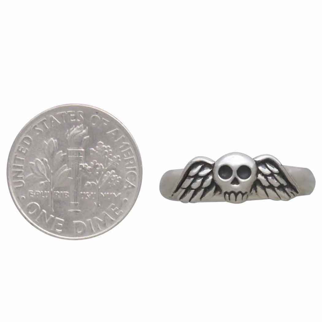 This sterling silver winged skull ring is a charming piece featuring a miniature skull with intricately detailed wings on either side. Symbolizing both mortality and freedom, it serves as a stylish and meaningful addition to any jewelry collection. Besides being haunting and a bit morbid, we're drawn to skulls because they symbolize rebirth, renewal, and spiritual awakening.