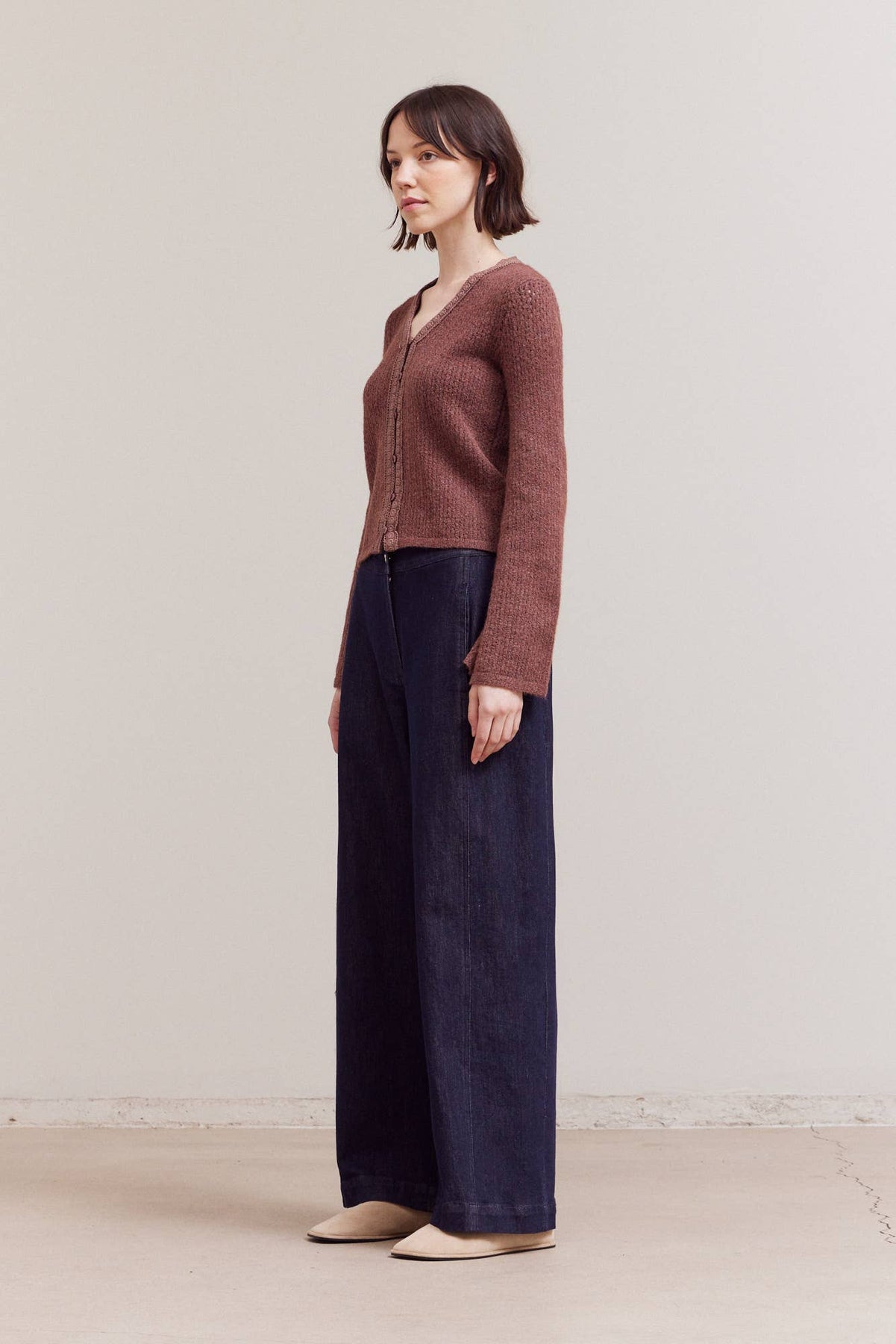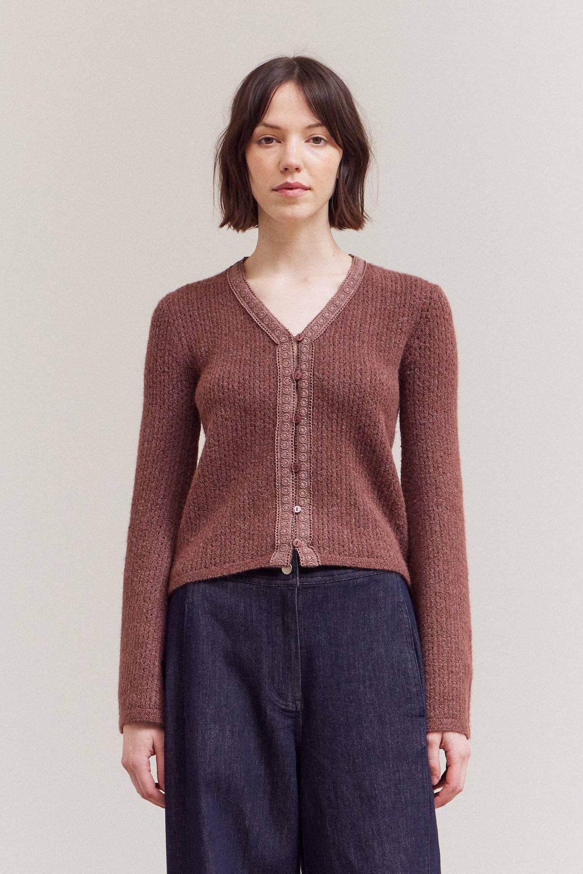 This is a classy button-up cardigan with an elegant lace trim. Perfect to wear alone or layer for warmth in the colder seasons.