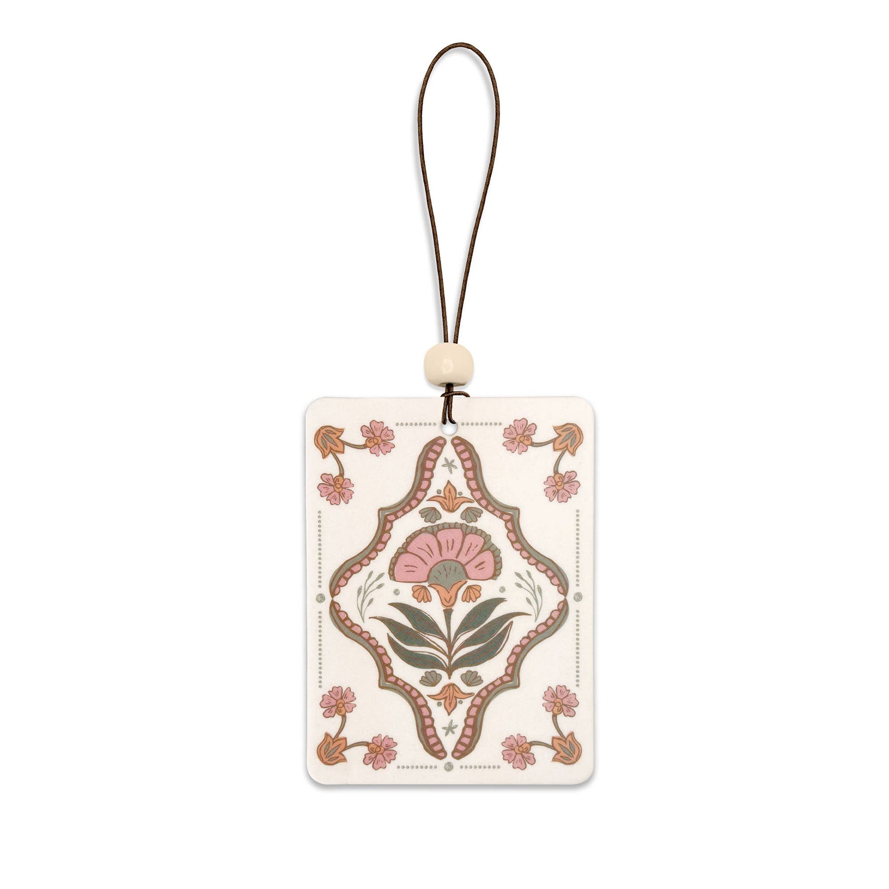 • Hangs by an elastic band with a decorative wooden bead