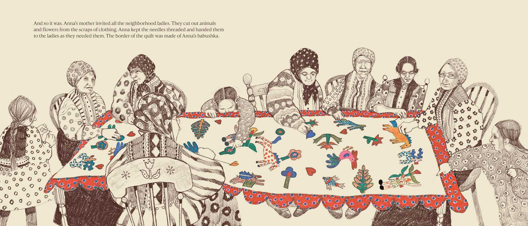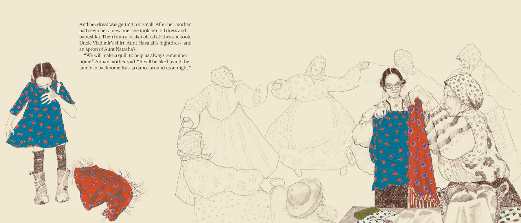 “We will make a quilt to help us always remember home,” Anna’s mother said. “It will be like having the family in backhome Russia dance around us at night.” And so it was. A basket of old clothes, Anna’s babushka, Uncle Vladimir’s shirt, Aunt Havalah’s nightdress, and an apron of Aunt Natasha’s become The Keeping Quilt, passed along from mother to daughter for almost a century. For four generations the quilt is a Sabbath tablecloth, a wedding canopy, and a blanket that welcomes babies warmly into the world. In strongly moving illustrations that are as heartwarming as they are real, Patricia Polacco tells t