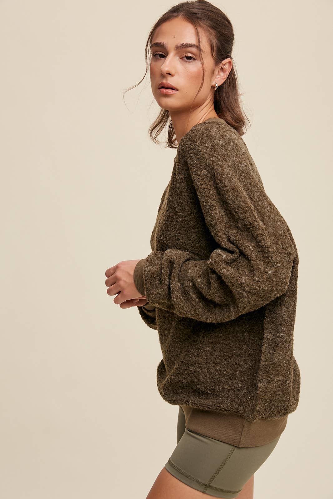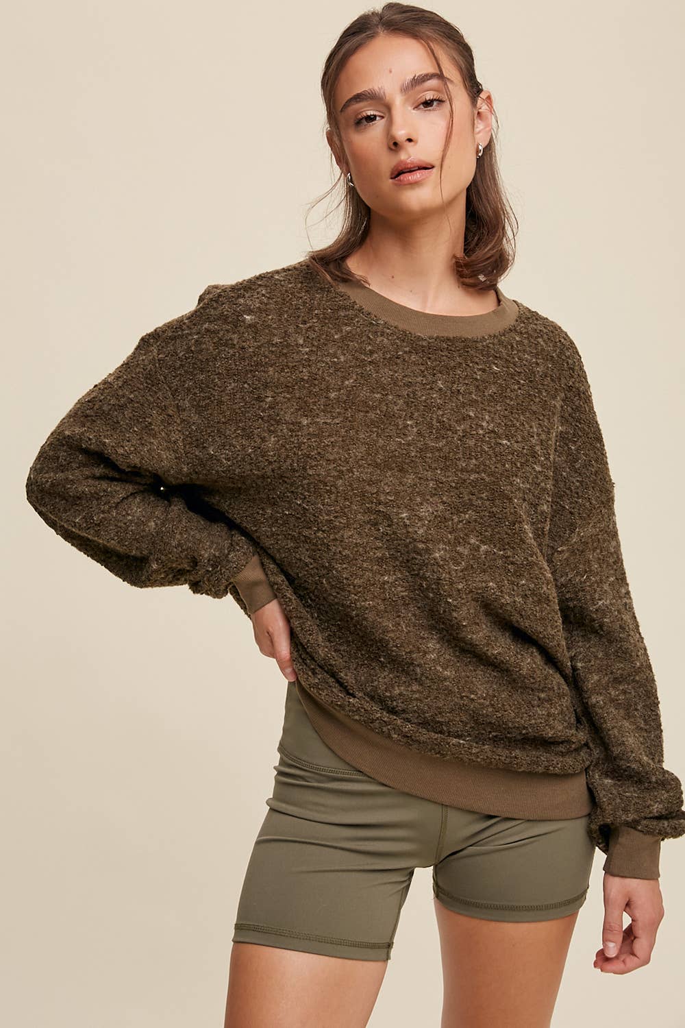 Effortlessly blending comfort and trend, this boucle pullover brings a modern twist to classic loungewear - perfect for pairing with denim shorts, jeans, or joggers for an easy yet polished casual outfit. Soft Boucle Knit: Made from plush loop-textured yarn that offers cozy warmth and a tactile, dimensional feel with a ribbed neckline and hem.