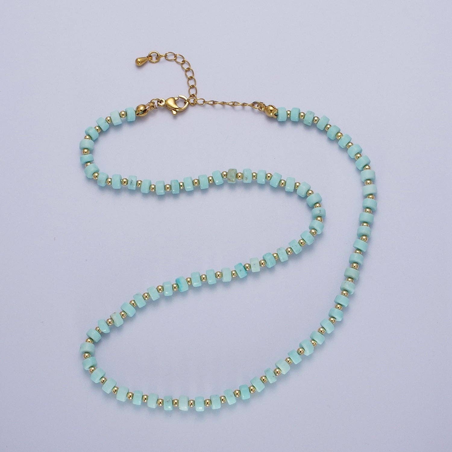 This 16-inch necklace features 4mm rondelle heishi turquoise beads accented with 18k gold-plated brass spacers. It includes a 2-inch extender for adjustable length, combining vibrant blue tones with elegant gold details for a versatile and stylish look.
